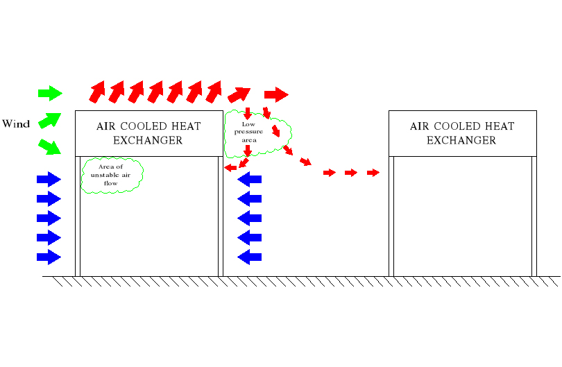 Wind increases the risk of hot air recirculation in a number of ways. Firstly, the plume of hot air rising from the air cooler exit is pushed sideways. This makes recirculation on the downwind side of the source cooler more likely, and also gives the hot air the potential to travel to another air cooled heat exchanger. Secondly, the wind will create a low pressure area on the downwind side of the source heat exchanger which will encourage air movement in the downward direction (see Figure 3).